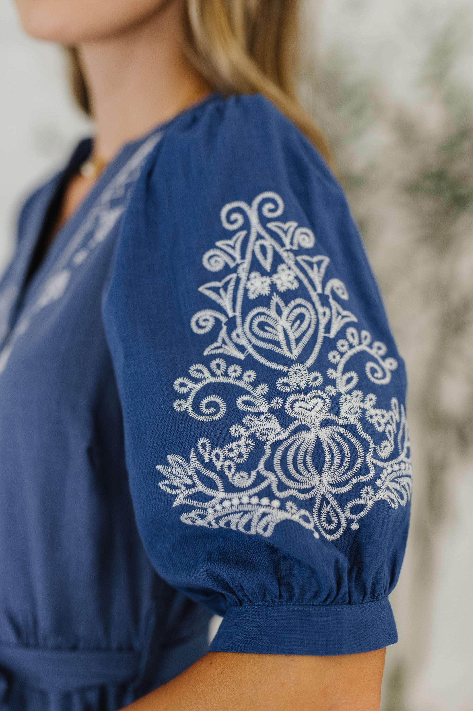 The Delicate Devotion Puff Sleeve Dress in Blue is a playful mix of elegance and comfort. Crafted from woven fabric with a flattering V-neckline, it features charming balloon sleeves with banded cuffs and gathered tiers for a flirty silhouette. Functional belt loops and a detachable waistband tie let you customize your fit, while side pockets keep essentials close. Finished with delicate machine embroidery, this dress is perfect for twirling through your day with style and ease.