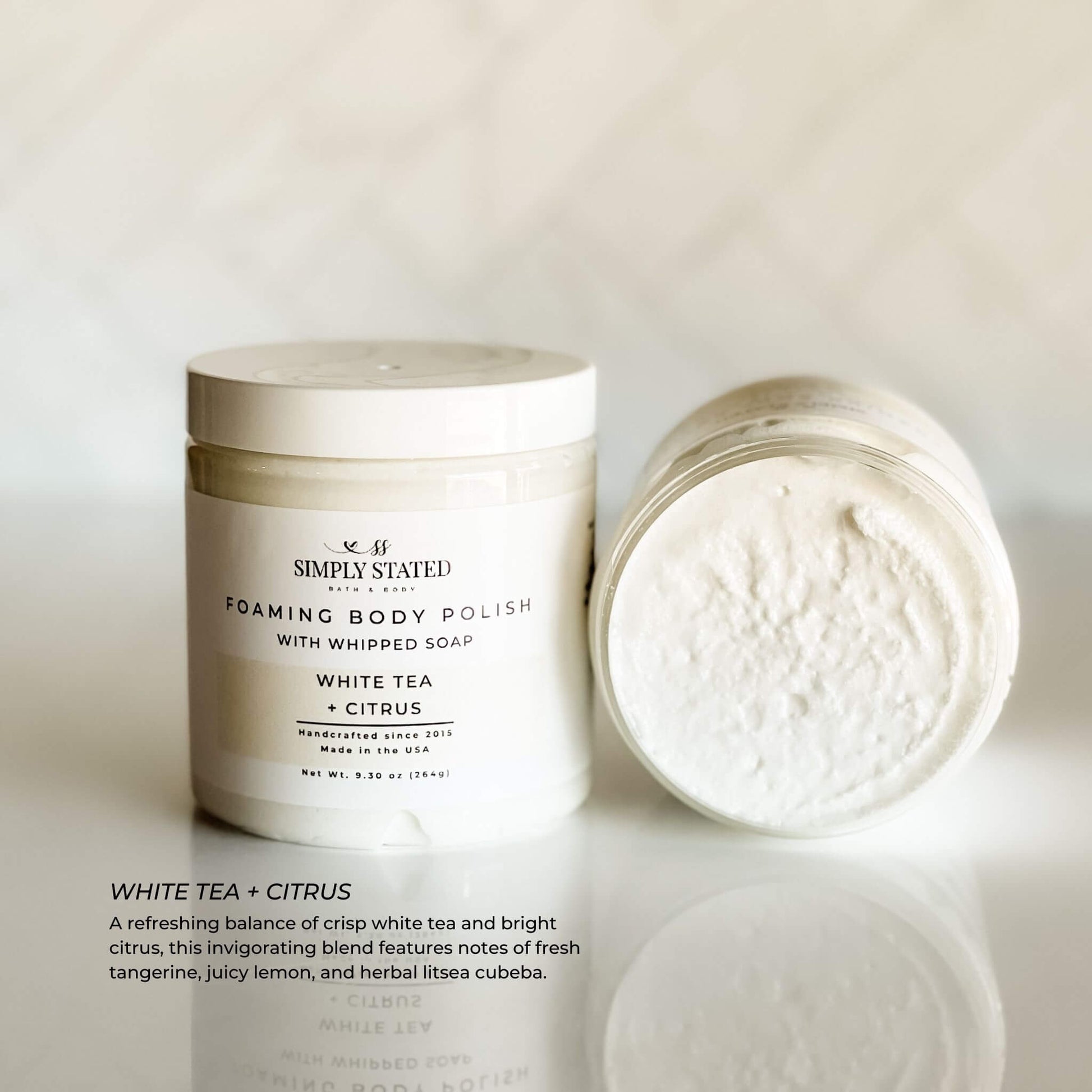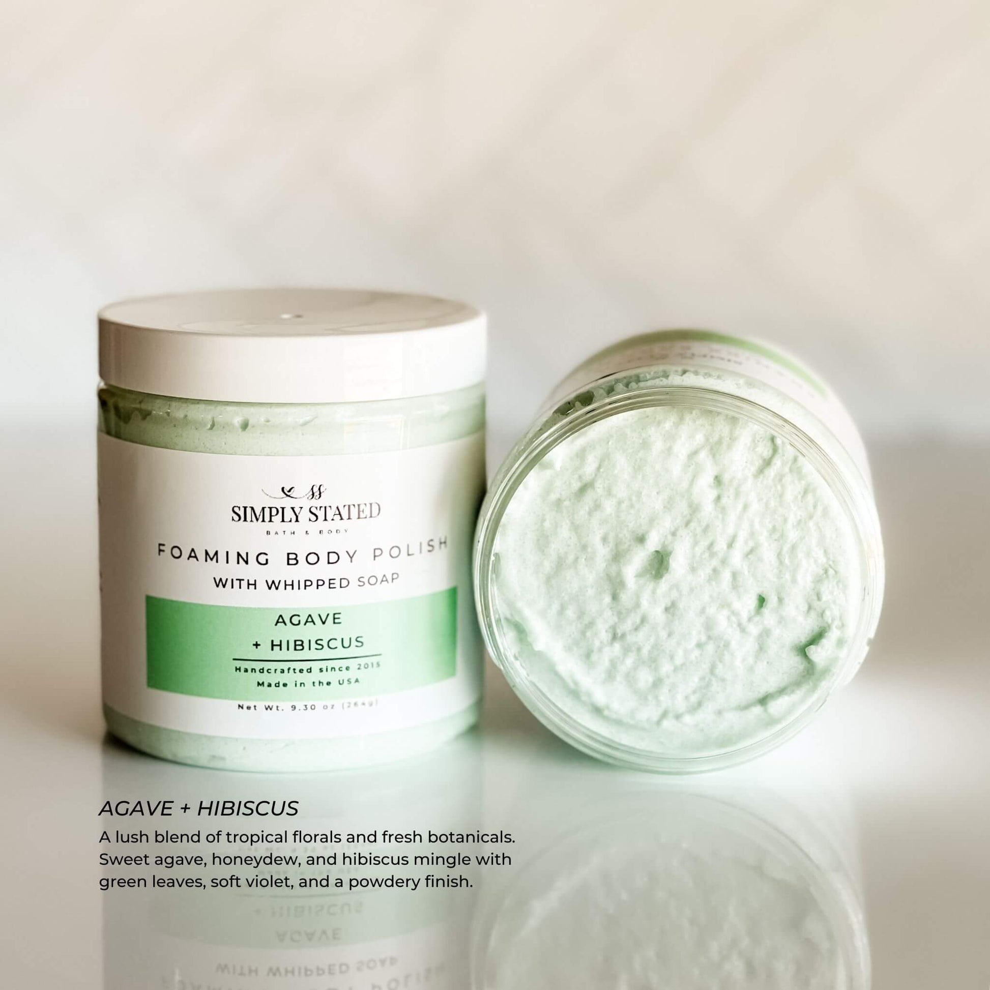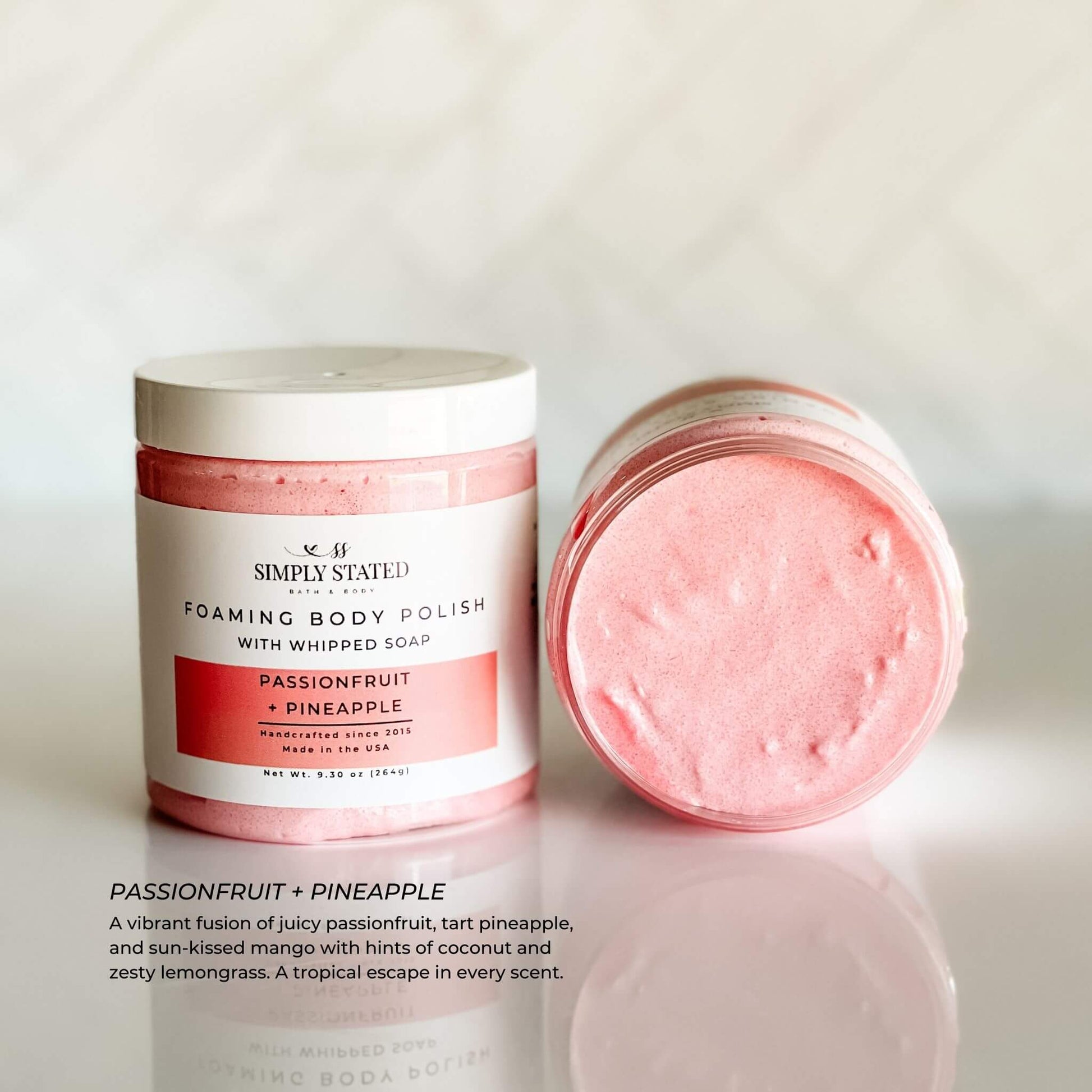 Cleanse, exfoliate, and glow with our rich and creamy Foaming Body Polish. Made with fine sugar crystals, nourishing oils, and whipped soap, this scrub gently buffs away dry skin while leaving behind lasting moisture. Experience the perfect summer glow with a fresh, tropical scent.